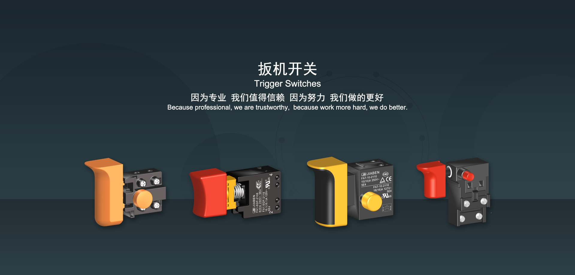浙江佳奔電子有限公司始建于1986年,坐落于浙江省樂清市虹橋鎮(zhèn)東電子信息產(chǎn)業(yè)園內(nèi),現(xiàn)有職工700多人,資產(chǎn)總額超3億元。公司主要經(jīng)營“JIABEN”牌微動(dòng)開關(guān)、蹺板開關(guān)、按鈕開關(guān)、扳機(jī)開關(guān)、調(diào)速開關(guān)和電位器開關(guān)等各類交、直流器具開關(guān)和各類交、直流線路板模塊等產(chǎn)品,主要應(yīng)用于交、直流電動(dòng)工具、電動(dòng)園林工具、清潔器具、家用電器和小型機(jī)床等行業(yè),是集產(chǎn)品設(shè)計(jì)、研發(fā)、制造、銷售和服務(wù)于一體的國家高新技術(shù)企業(yè)。JIABEN was founded in 1986, located in East Electronic Information Industry Park, Hongqiao Town, Yueqing City, Zhejiang Proviance, existing staff more than 700 peoples, more than 300 million RMB worth of assets. Company is mainly engaged in "JIABEN" brand Micro Switch, Rocker Switch, Push-button Switch, Trigger Switch, Speed Regulating Switch, Potentiometer Switch and other kinds of appliance switch and all kinds of AC or DC circuit board module, such as more than 100 series, 8000 kinds of models of products, mainly used in AC or DC Power-tools, Power Gardening Tools, Cleaning Appliances, Household Appliances and Small Machine Tool and other industries, is the collection product design, research and development, manufacturing, sales and service in one of the national high and new technology enterprise.